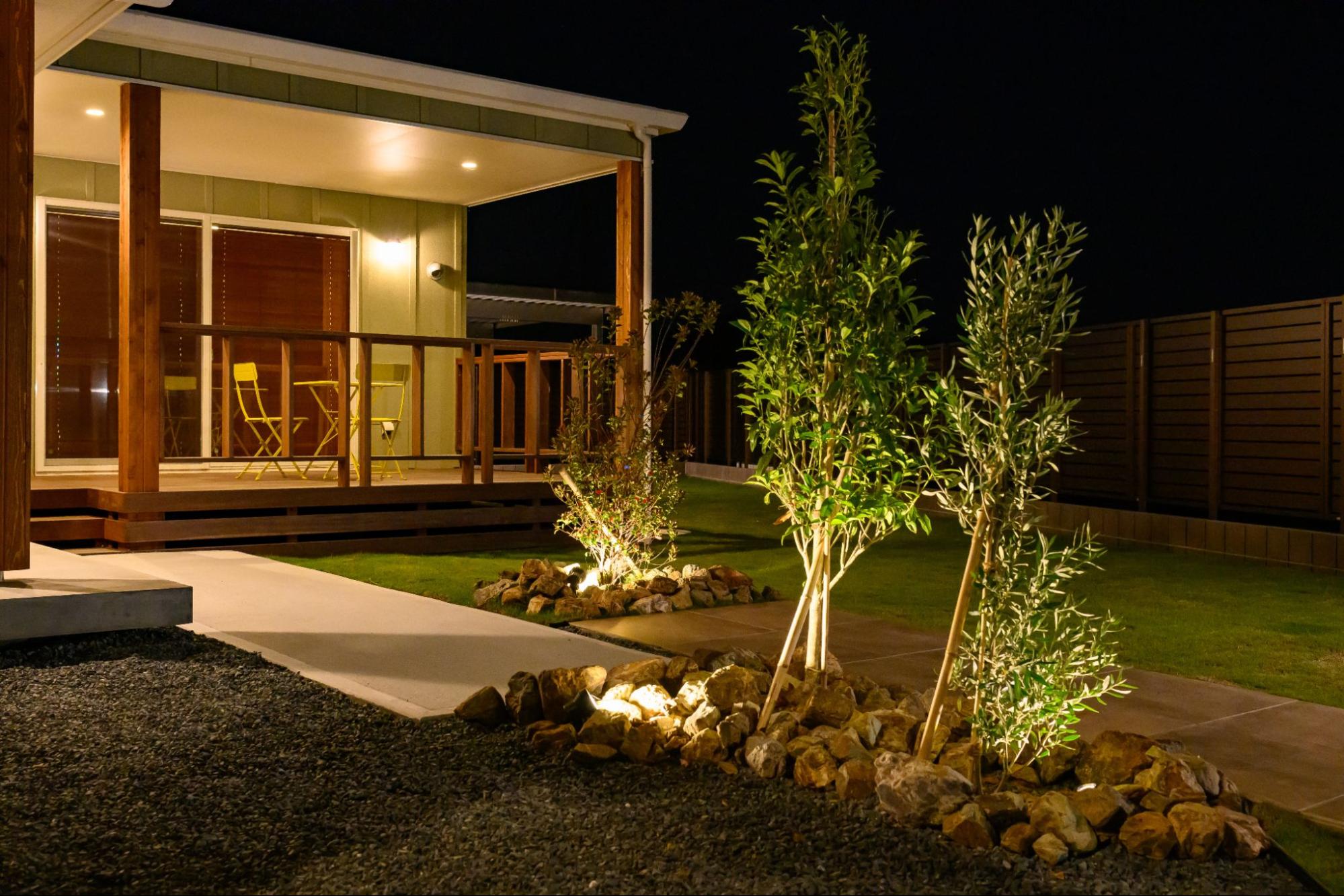 くつろぎの明りに包まれて夜を楽しむ庭。